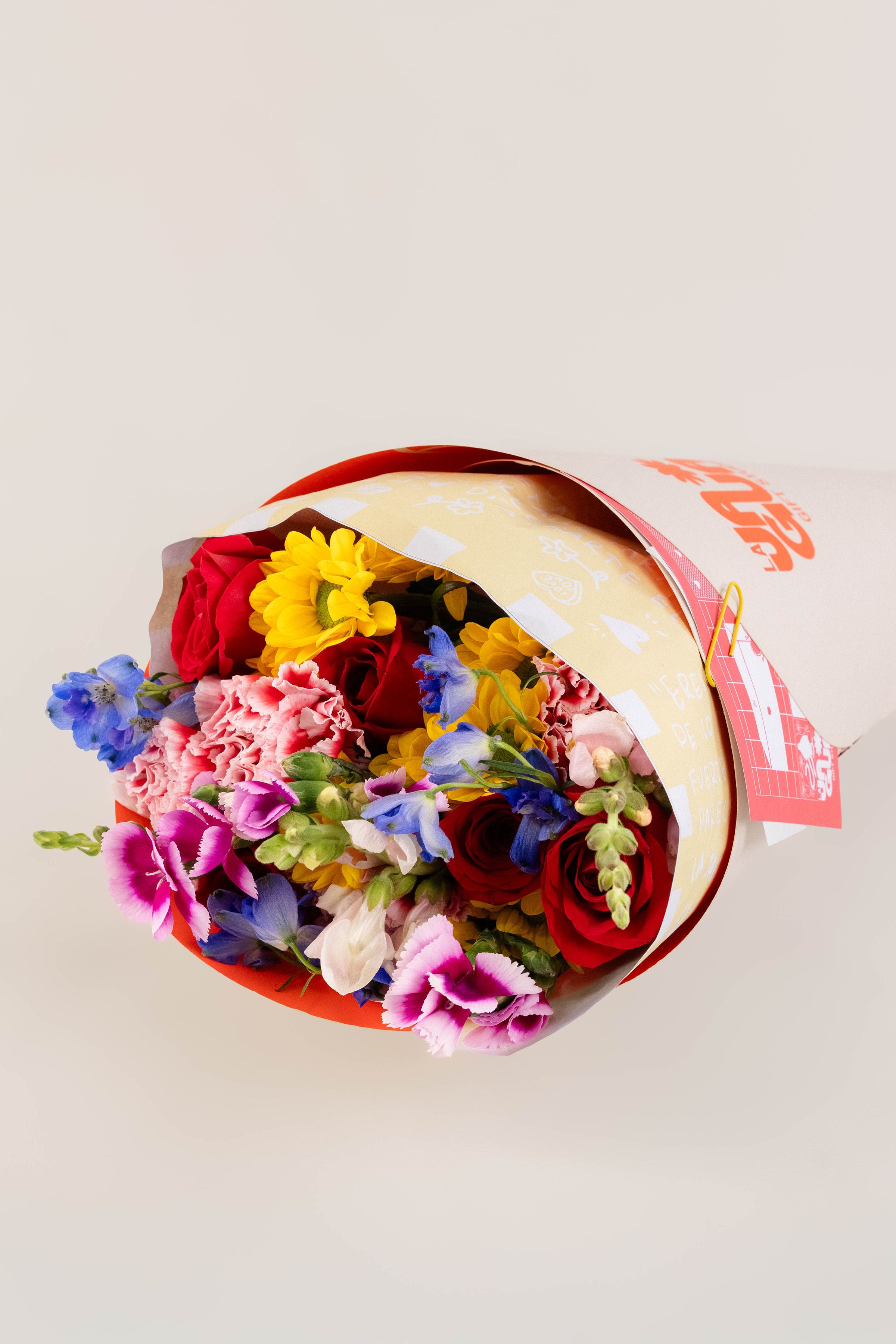 - Tallos: 20 tallos de variedades surtidas puede incluir rosas, boca de dragón, rosa spray, clavel, aster, y solidagio (disponible en tonos multicolor, pastel y amarillo).