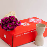 ¡Kit La Jagua! Nuestro kit de flores + florero, es la opción perfecta para regalar o para poner en cualquiera de tus espacios. Este kit incluye nuestro bouquet de margaritas o pompones del color del día, y un florero. Empacado en nuestra icónica caja naranja.